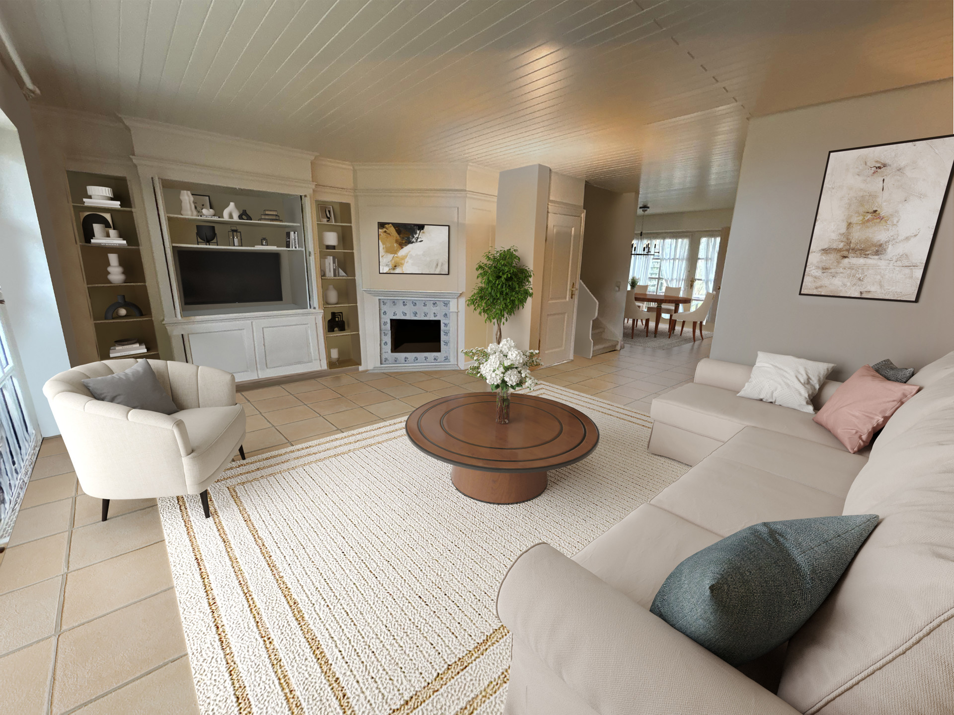 Im Erdgeschoss erwartet Sie ein einladender Eingangsbereich mit Garderobe und Gäste-WC. Der helle Wohnbereich mit Zugang zur sonnigen Ostterrasse lädt zum Verweilen ein. Angrenzend befinden sich das Esszimmer mit Zugang zur Westterrasse sowie die Küche – ein durchdachter Grundriss mit fließenden Übergängen.