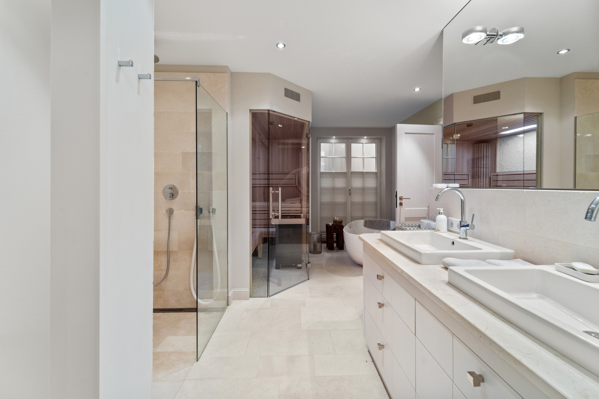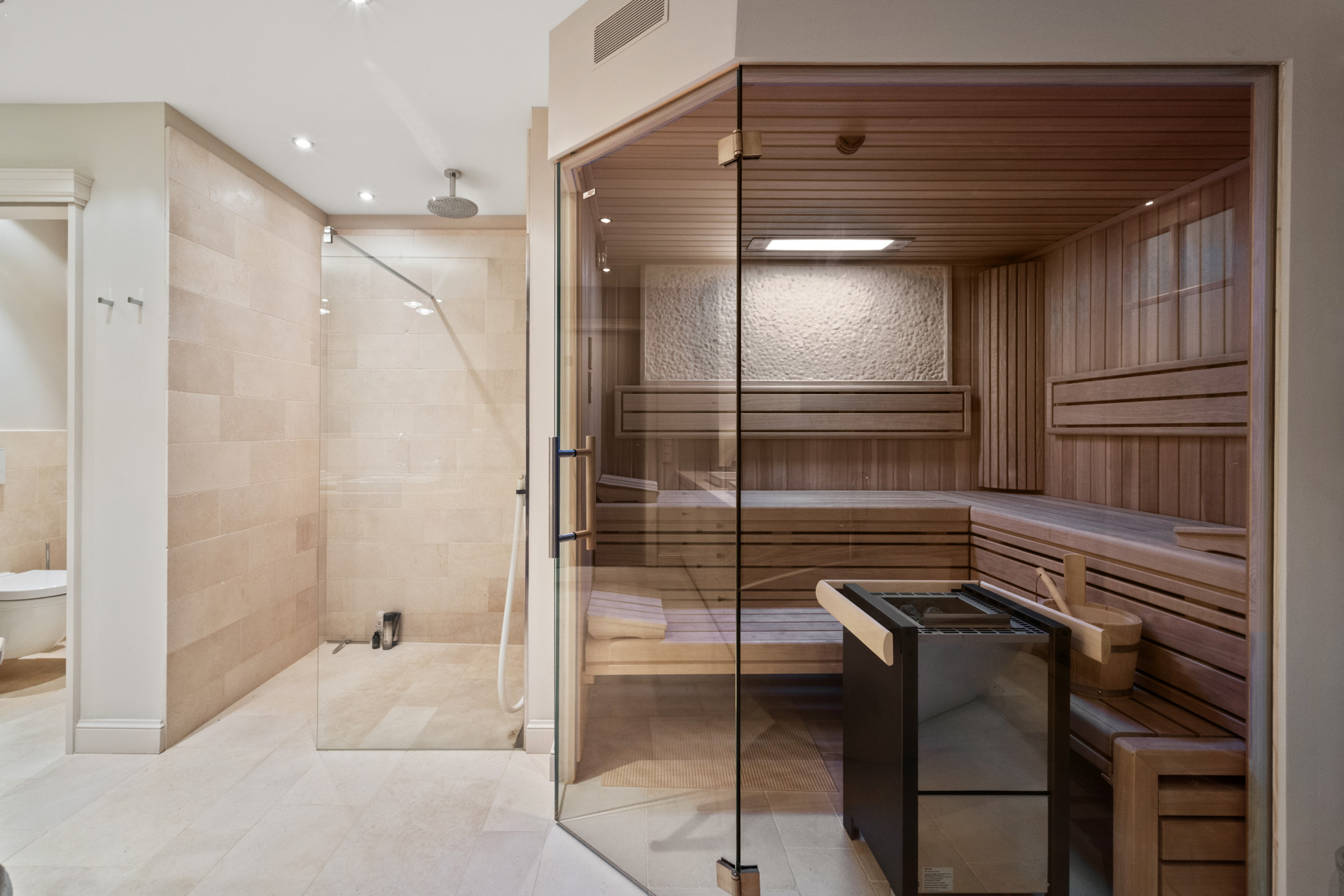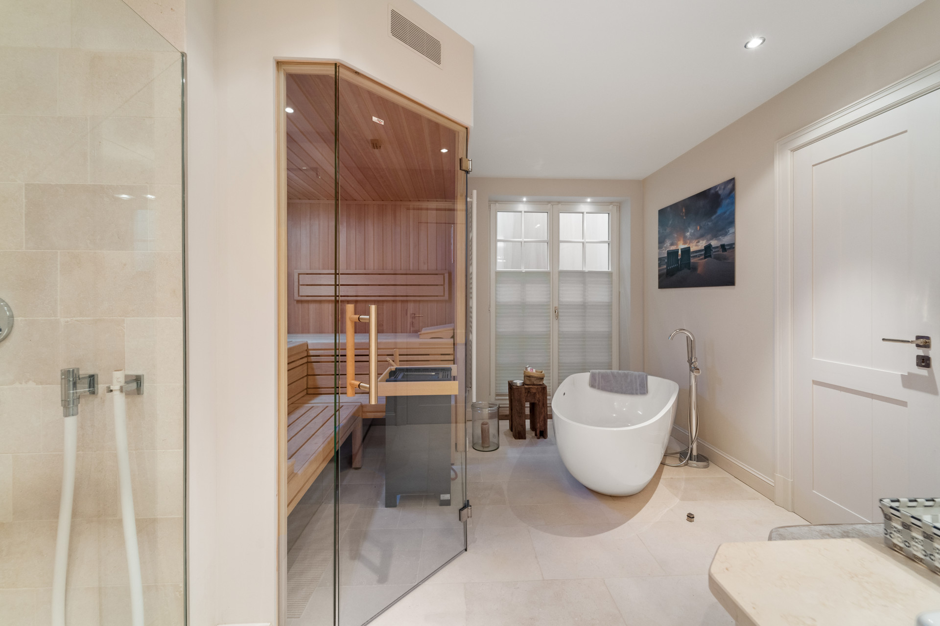 Im Untergeschoss erwartet Sie ein Wellnessbereich mit finnischer Sauna, ein Badezimmer mit Dusche und Wanne, ein separates Gäste-WC sowie zwei vielseitig nutzbare Abstellräume. Der Technikraum bietet zusätzlichen Stauraum.