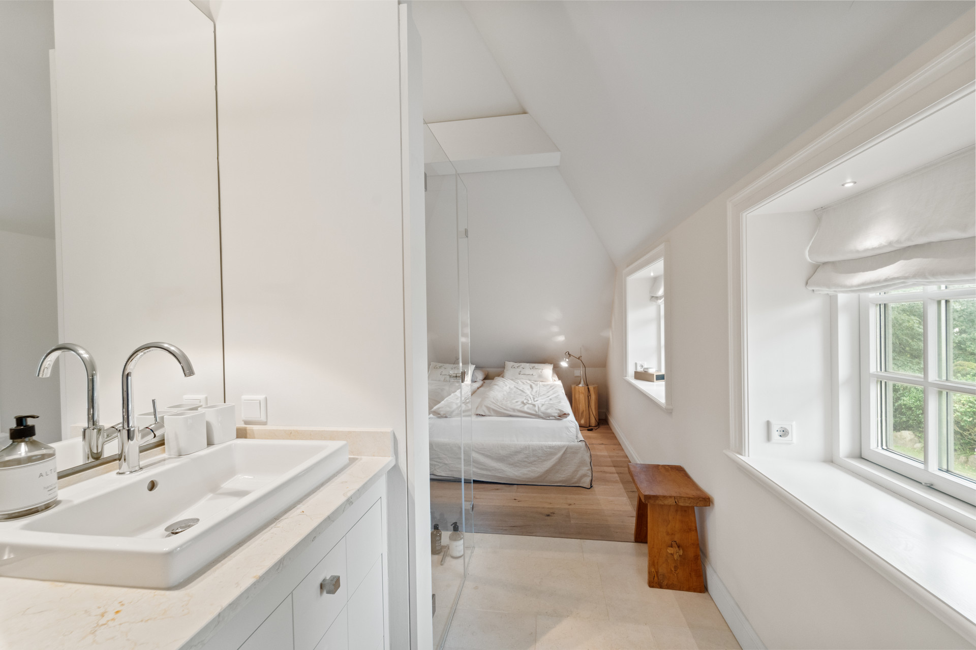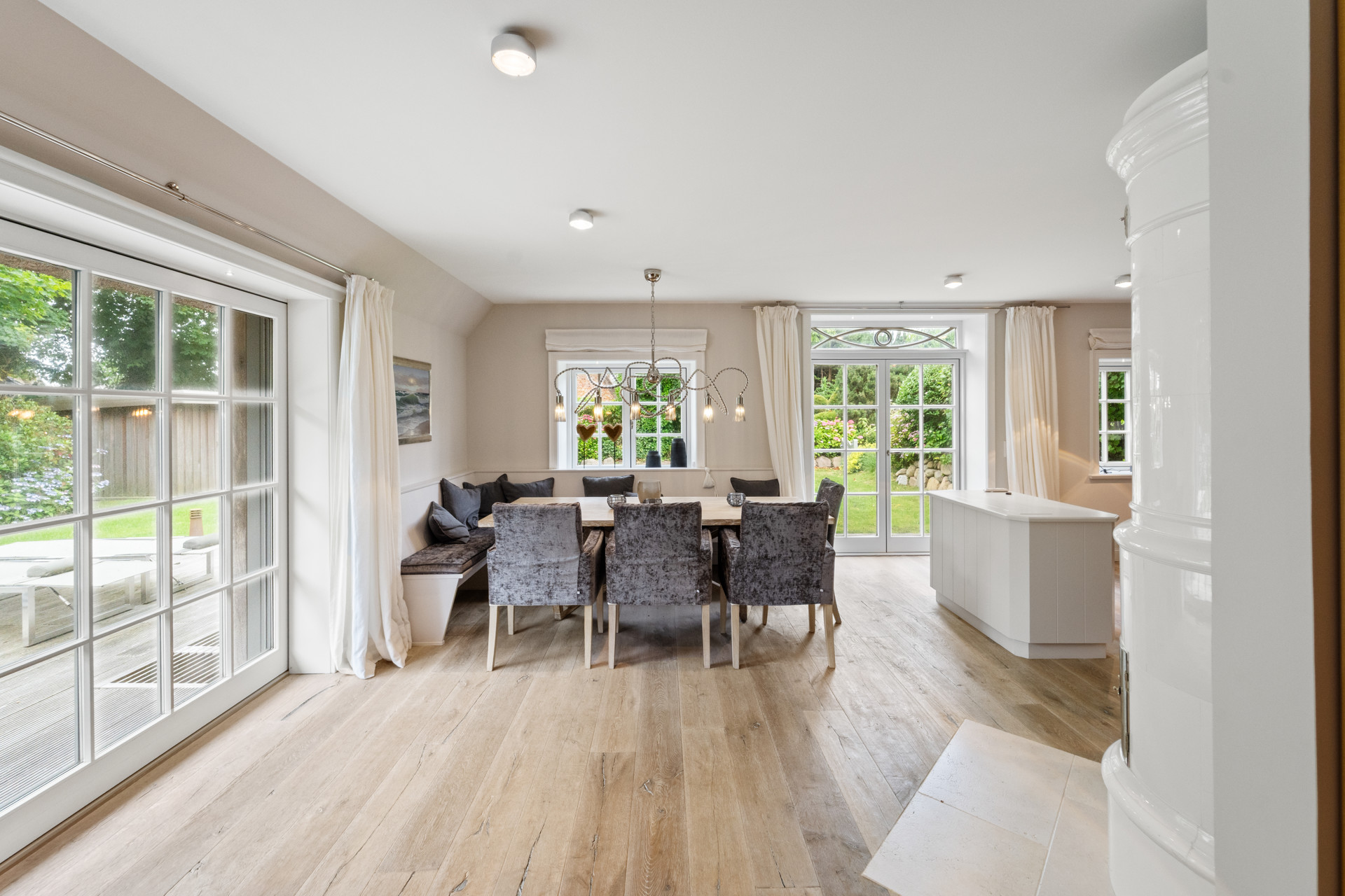 Im Erdgeschoss empfängt Sie eine helle Diele mit Gäste-WC und Garderobe. Der offen gestaltete Wohnbereich mit Kamin, Sofaecke, moderner Küche und angrenzendem Essbereich schafft eine einladende Atmosphäre. Zwei großzügige Doppelschlafzimmer mit jeweils hochwertigem Bad en suite befinden sich im Obergeschoss.