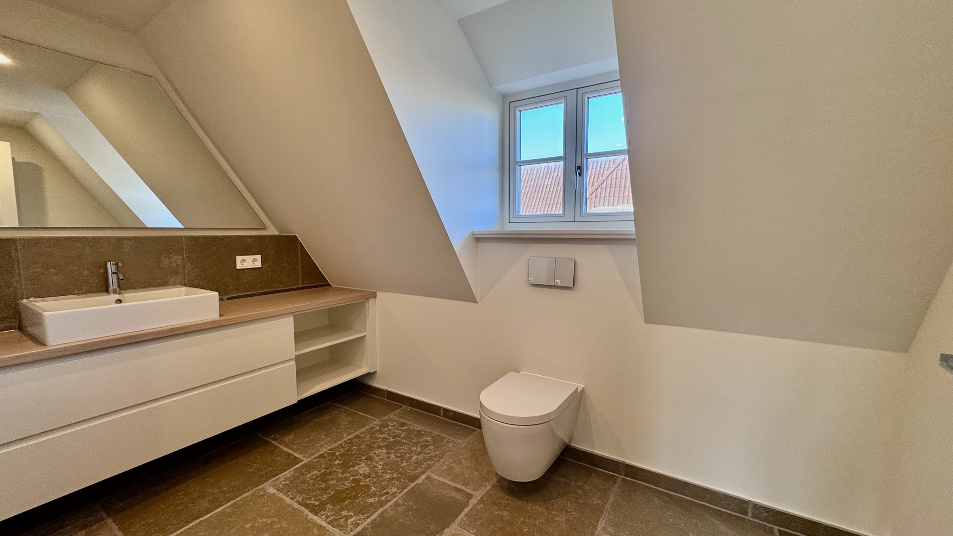 Hochwertige Natursteinfliesen von Sölstiin-Persch, helle Landhausdielen und eine Fußbodenheizung verleihen dem Haus eine warme, elegante Note. Ein Stellplatz und eine Garage runden dieses stilvolle Reetdomizil ab.