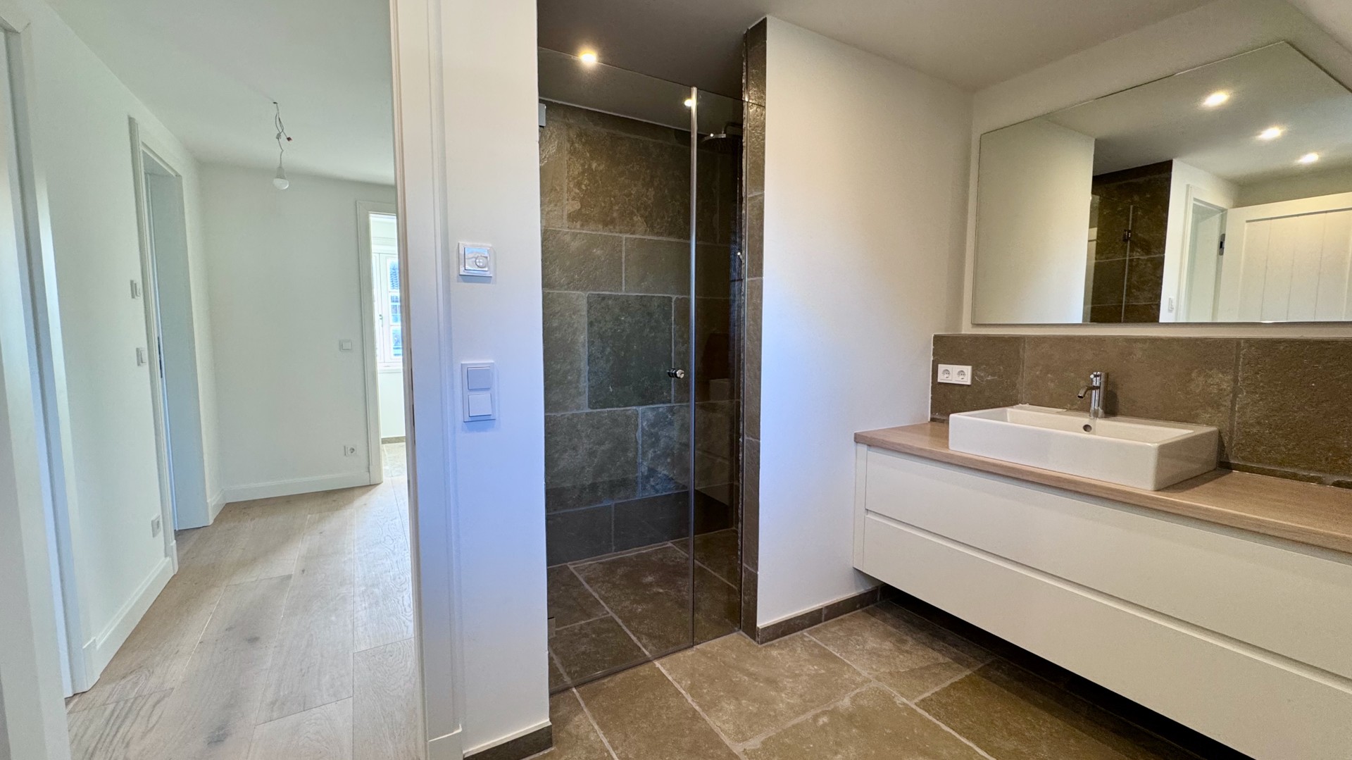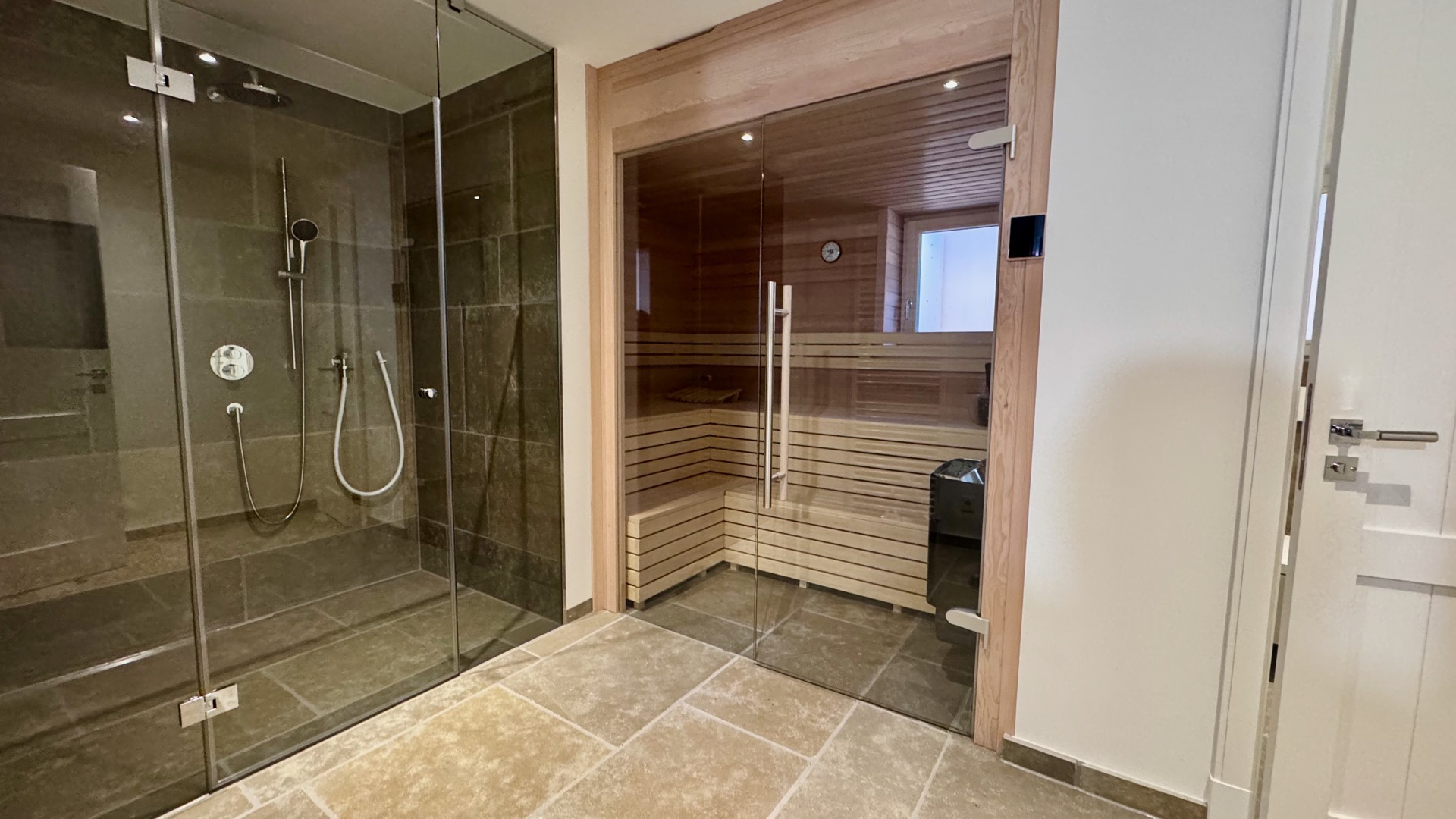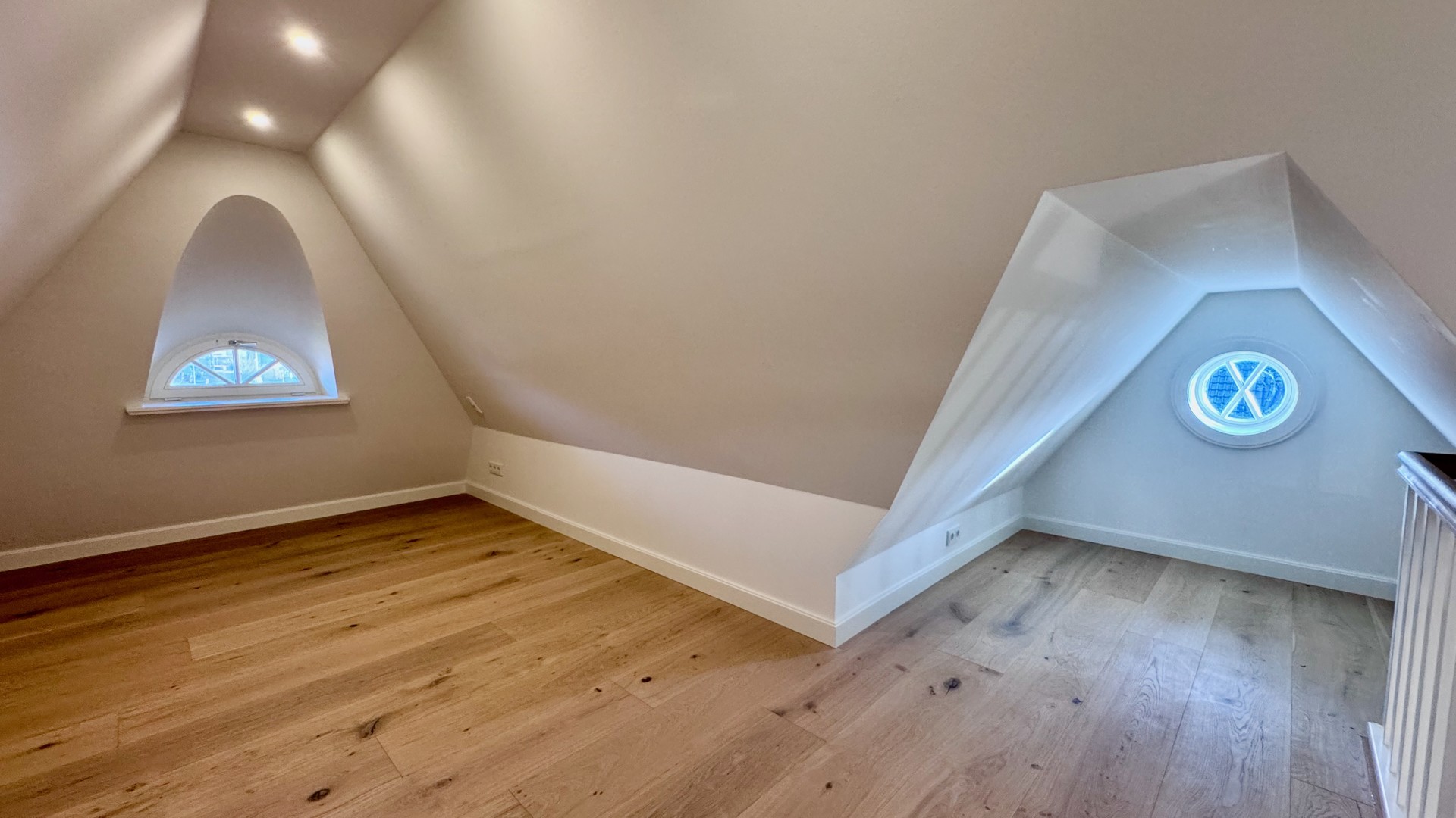 Im Obergeschoss erwarten Sie zwei komfortable Schlafzimmer, ein hochwertiges Duschbad und ein separates WC. Das Untergeschoss beherbergt ein weiteres, genehmigtes Schlafzimmer mit Bad en Suite, eine maßgefertigte Sauna mit Duschbad sowie ausreichend Stauraum. Der ausgebaute Dachboden schafft zusätzlichen Platz für Gäste oder als Rückzugsort.
